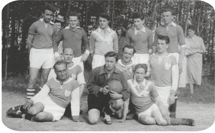 2.Mannschaft in Wiernsheim. Stehend von links nach rechts: Hermann Stalder, Karl Lutz, Helmut Platzer, Bruno Xander, Heinz Fischer, Heinz Müller, Klaus Bluhm; kniend: Engelbert Eisenreich, Horst Schnitzer, Helmut Bohnenberger