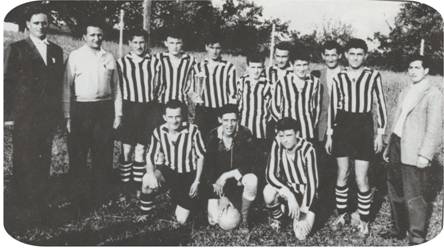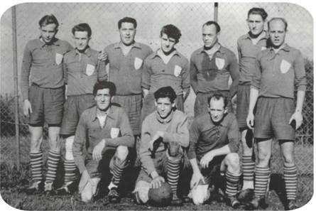 1954- Meisterschaft in Illingen. Von links nach rechts: Bürgermeister Helmut Harsten, Trainer Hermann Zeller, Kassier Erich Schaal, Karl Kurz, Willi Brosi, Alfred Orth, Willi Braun, Klaus Bluhm, Heinz Fischer, Helmut Platzer, Rolf Hermann, Hans Brosi, Rudolf Kotzab, Rolf Brosi, Vorstand Gotthilf Orth, Rudolf Kurz aus Amerika, 2.Vorstand Emil Holzhäuer.
