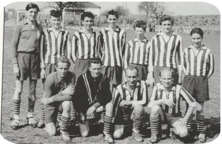 Staffelmeister B-Jugend in Enzweihingen ca. 1950. Stehend: Albert Zuckschwerdt, Hans Pascher, Hans Kinzinger, Hermann Stalder, Rolf Hermann, Rolf Brosi, Rolf Walter, Karl Lutz; kniend: Rudolf Kotzap, Richard Xander, Heinz Müller